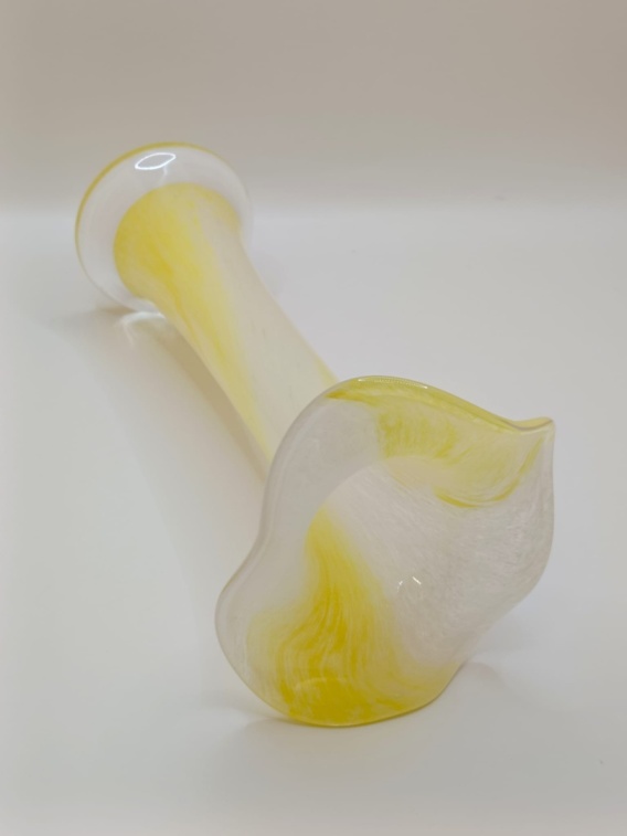 Wykonany w technice opalowej (mleczno-perłowej) ze szkła barwionego w odcieniach bieli i żółci, z charakterystycznymi smugami i skręconą formą korpusu. Falowany, szeroko rozchylony brzeg nadaje mu wyjątkową, dekoracyjną formę – typowy wzór polskiego szkła artystycznego, prawdopodobnie z Huty Krosno lub Sudety w Szczytnej, ręcznie formowany w latach 60.-80. XX w.