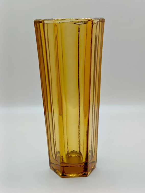 Wyjątkowy wazon heksagonalny, zaprojektowany przez cenionego polskiego artystę Bogdana Kupczyka dla Huty Szkła Gospodarczego Ząbkowice. Szkło barwione w masie na ciepły, bursztynowy kolor,który dodaje elegancji i głębi. Graniasty korpus i szlifowana podstawa to kwintesencja polskiego szkła z lat 70.-80.