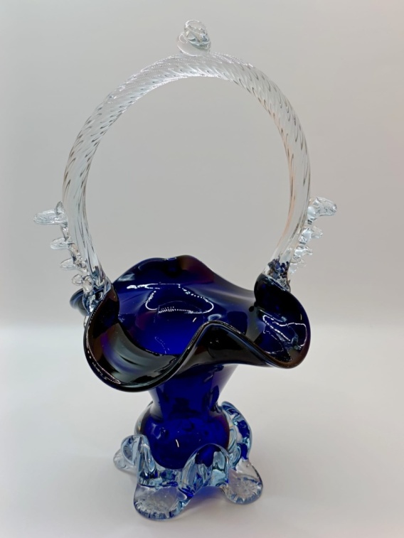 Przepiękny koszyczek szklany w głębokim kobaltowym kolorze, wykonany w stylu vintage. Misternie formowany z wysokiej jakości szkła, urzeka delikatnymi zdobieniami i eleganckim, plecionym uchwytem z przezroczystego szkła, który dodaje lekkości. Stabilna podstawa na czterech ozdobnych nóżkach podkreśla wyjątkowy charakter przedmiotu, czyniąc go idealnym dodatkiem do wnętrz urządzonych w stylu retro, klasycznym lub boho.