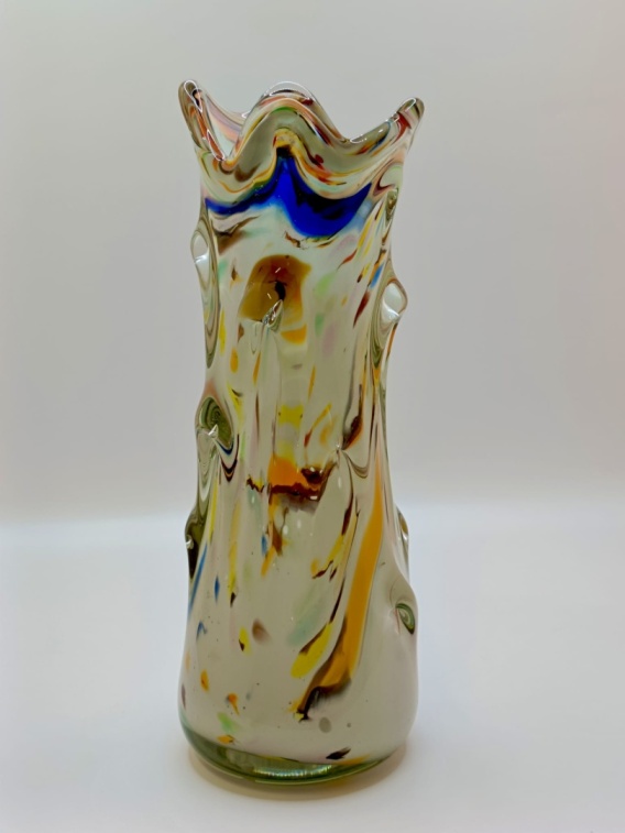 Na sprzedaż oferuję unikalny wazon sękacz z lat 60., wykonany z kolorowego szkła o wysokości 21 cm. Charakteryzuje się artystycznym wzorem z falistymi, wielobarwnymi smugami w odcieniach żółci, pomarańczu, błękitu i zieleni, co nadaje mu wyjątkowego, retro uroku. Wazon jest w dobrym stanie, idealny do dekoracji wnętrz w stylu vintage lub jako oryginalny prezent.